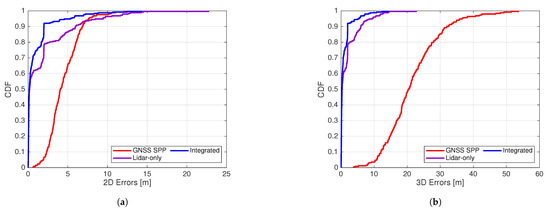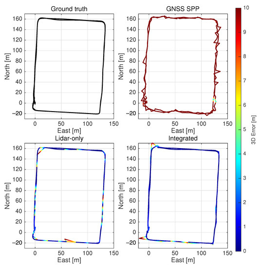 - It was demonstrated that the proposed positioning approach (Integrated) can achieve centimeter- to meter-level 3D accuracy for the entirety of the driving duration in densely built-up urban environments, where the accuracy of GNSS code measurements is low and standalone lidar positioning may not always be available;