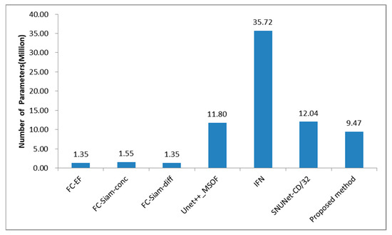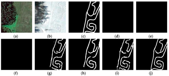 - SNUNet-CD [43] is a recently proposed densely connected Siamese network that is used for remote sensing image CD. The network can reduce the loss of image information and improve the network image feature extraction capability by dense connection. The network also uses the ECAM module to extract the most representative features in the image, and the experimental results are better. We selected the SNUNet-CD method with a channel size of 32 for comparison.