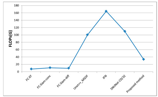 - A series of experimental comparisons show that our method performs better than the other SOTA methods in terms of metrics such as F1 score and OA on the remote sensing image change detection dataset (CDD) [55]. Meanwhile, our method achieves a suitable balance between network performance and number of parameters.