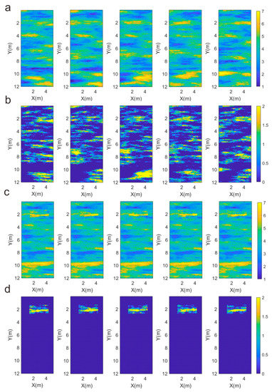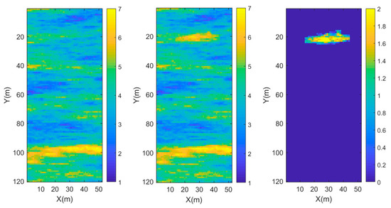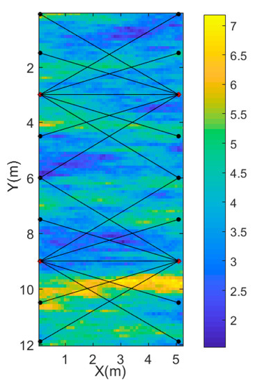 To test the effectiveness of the method, we simulate synthetic GPR data in Figure 2. A reference model , of size 5.2 × 12 m (52 × 120 = 6240 pixels of size 0.1 m × 0.1 m), was generated from a multivariate Gaussian probability distribution. The electrical conductivity of the synthetic reference model was set to a constant value of 3 mS/m. The mean of the relative dielectric permittivity is 3.97 and the variance is 0.75.