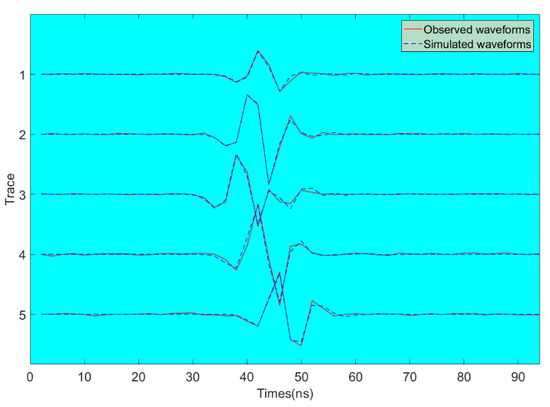 We used the FDTD algorithm to calculate a full-waveform synthetic dataset. The FDTD model with a regular grid consisting of square cells of 0.1 × 0.1 m to solve Maxwell’s equations and the number of boundary cells is 40. The source pulse is a ricker wavelet and the central frequency of the ricker wavelet is 100 MHz. In the synthetic data, we assume source pulse is known. However, it should be noted that the source wavelet needs to be estimated for the real data. Some estimation methods can solve this problem [38,39].
