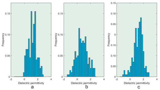 In order to analyze the disturbance location from the inversion results, we enlarged the target area in Figure 9. The first picture in Figure 9b is the designed perturbation model. It shows that Figure 9a is far from the designed perturbation model, while Figure 9b reflects the characteristics of the designed perturbation model. Furthermore, we made a statistical analysis of the target area; the histogram of the statistical data is shown in Figure 10; the specific mean and variance are shown in Table 1.