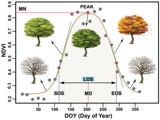 where is the calculated relative changing rate of NDVI at time t and is the NDVI value at time t. Occurrence dates were obtained using these smoothed NDVI time series. SOS and EOS dates were determined as the day with the maximum and minimum . LOS was determined to be the difference between EOS and SOS. MN was defined as the peak of vegetation growth, i.e., the NDVI value corresponding to closest to zero. MD date was the middle date between the EOS date and the SOS date. The description of phenology metrics correlations is shown in Figure 2.