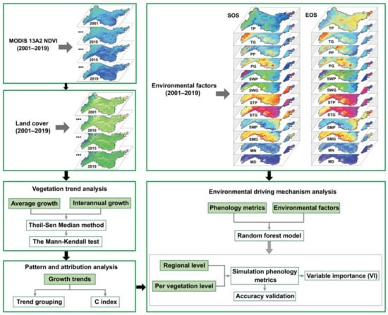 Flowchart of the method used in this study. MODIS 13A2 NDVI (2001–2019), in which the spatiotemporal distributions of NDVI for 2001, 2010, 2015 and 2019 are presented as examples of NDVI time series used as extract phenology metrics. Land cover (2001–2019), in which the spatiotemporal distribution of land cover for 2001, 2010, 2015 and 2019, used as an example of the changes in different vegetation types. Environmental factors, the first column indicates the drivers for SOS and the second column indicates the drivers for EOS, and shows the spatial distribution of each driver separately, which is used to example the predictors used for RF models.