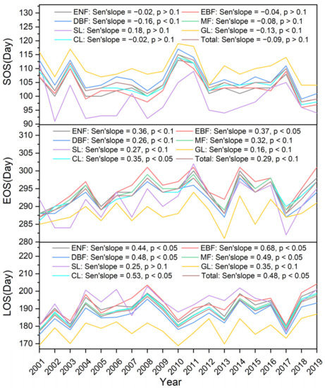 Then, we used the Mann-Kendall (MK) method to test the significance of time series trends, which is a nonparametric statistical test and is robust to outliers [37]. We used the normal cumulative distribution function to determine the p-value of the MK test statistic with a significant confidence level of p < 0.1. In this study, we used Sen’s slope and MK test to trend analysis and significance test the spatial distribution (average growth) and interannual variation (interannual growth) of LSP for different vegetation types from 2001 to 2019, all using MATLAB 2017a were completed.