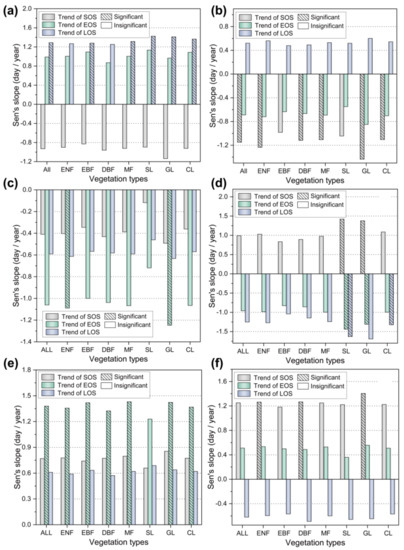 In addition, we found that ENF, EBF, MF, SL, and CL were all controlled by EOS trends, while the variations in LOS for two vegetation types, DBF and GL, were controlled by SOS trends (Table 5). As Figure 4e shows, the growing season lengths of DBF and GL are short, and there are previous studies demonstrating that the effect of EOS shifts on vegetation with short growing season cycles is insignificant [53]. The percentage of growth pattern type II is higher than other vegetation types in DBF and GL, and the advance in SOS is also significant, resulting in SOS dominating the variation in LOS (Table 4). Therefore, we suggest that the asymmetry in SOS and EOS trends contributing to LOS is related to vegetation types, and that future studies should focus on vegetation types to accurately model and predict vegetation phenology periods.