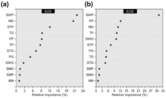 For the QMs, different drivers affect the interannual variability in SOS and EOS (Figure 8 and Table 6). The SWP, MD, and STP are the three most important factors influencing the interannual SOS variation, and the relative importance accounts for 54.4% of total (Figure 8a and Table 6). The total percentage of TG, PP, TP, STG, and PG was 39.2%, and the effect of TG and PP on the interannual SOS variation was almost the same. The remaining four variables (SWG, SMG, SMP, and MN) have a very small effect on interannual SOS variation, and their combined percentage was only 6.4%. Figure 8b and Table 6 also show that SWP, PP, and MD are the three most important factors influencing the interannual EOS variation, with a total relative importance of 54.0%, and the influence of SWP is much stronger than that of PP and MD. The effects of TP, SWG, STP, PG, TG, and STG on the interannual EOS variation totaled 41.9%, and the effects of TP and SWG on the interannual EOS variation were not very different, with a relative importance of 10.2% and 9.9%, respectively. There was also little difference in the relative importance of PG, TG, and STG. The effect of the single variable of STP on the interannual EOS variation (7.2%) is much larger than the sum of SMP, SMG, and MN (4.1%).