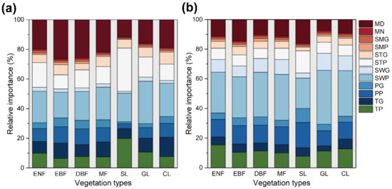 The relative importance of drivers that affect interannual variations in LSP for different vegetation types. Relative importance was derived from the importance scores of variables (VI) based on RF models established for different vegetation types: (a) SOS. (b) EOS. Different colors indicate different factors. Note: SOS or EOS as response variable in the RF model. The specific values for the relative importance of each driver are in Table S1.