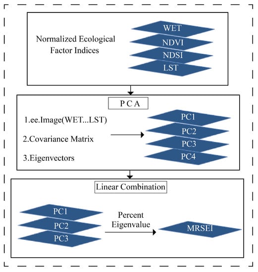 The covariance matrix between the normalized WET, NDVI, NDSI and LST is calculated, the eigenvalues and eigenvectors of the covariance matrix are obtained, and the principal components PC1, PC2, PC3 and PC4 are calculated according to the eigenvectors. The MRSEI is derived from the weighted sum of the first three principal components (Figure 2), and the weight of the weighted sum is the eigenvalue contribution rate of each independent component [], which is expressed as: