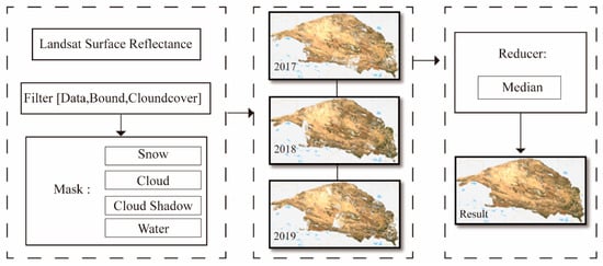 To reduce the error caused by phenological changes and ensure the comparability between MRSEI indices for various years, the images from 1 July to 31 August of the target year were selected in this study. Due to the high altitude and wide range of the Qaidam Basin, the images in the region are often covered by clouds, which affects the parameter inversion calculation. To ensure minimum cloud coverage in each image and fill in missing areas, the images for the target year of this study were synthesized from images of the target year and adjacent years of the same season (three years in total). This article took the image acquisition process in 2018 as an example to describe the image preprocessing in the GEE (Figure 3).