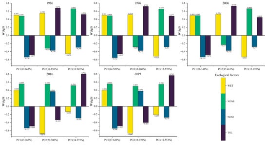 To test the comprehensive representativeness of the MRSEI index, this study adopts the method of equal interval extraction and successively selects the data in 1986, 1996, 2006, 2016 and 2019 as test samples for the model test. Based on the principal component analysis results of the sample years, the sum of the cumulative contribution rates of the first three principal components, PC1, PC2 and PC3, in 1986, 1996, 2006, 2016 and 2019 were 96.5%, 96.3%, 97.0%, 98.0% and 98.2%, respectively; they were all greater than 85% (Figure 4 and Table 4), indicating that the MRSEI integrates most of the information of various ecological indicators. In addition, dryness and greenness contributed the most to the MRSEI.