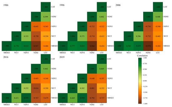 To test the comprehensive representativeness of the MRSEI, this study calculated the correlation coefficients among the five indices of the MRSEI, WET, NDVI, NDSI and LST in the same period and used the average correlation model to test the applicability of the MRSEI index. The average correlation was calculated based on the absolute value of the correlation coefficient between one index and the other indices []. The closer the result was to 1, the stronger the comprehensive representativeness of the index was, which is expressed as: