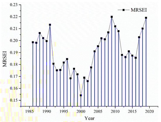 To enable comparison between MRSEI images from different time periods, the MRSEI results of each year were normalized. The closer the MRSEI was to 1, the better the eco-environmental quality was; the closer the index was to 0, the worse the eco-environmental quality was.