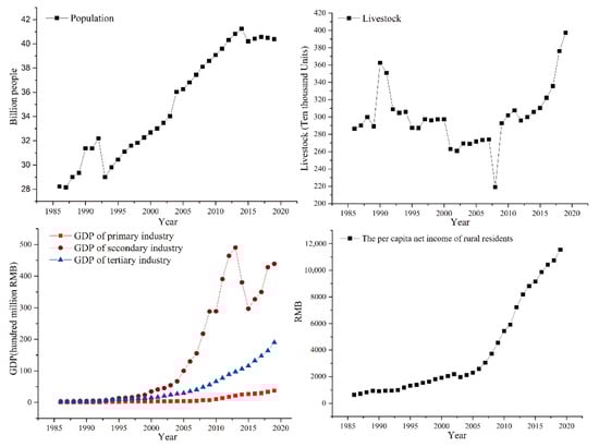 As Haixi Mongolian-Tibetan Autonomous Prefecture covers most of the Qaidam Basin, this study uses the Haixi Prefecture statistical yearbook to compile statistics on GDP, rural per capita income, population and livestock volume within the Qaidam Basin. The specific data were obtained from the 1986–2019 Qinghai Provincial Statistical Yearbook (http://tjj.qinghai.gov.cn/ accessed on 3 November 2021). In addition, the types of livestock grazing in the study area are mainly cattle and sheep. In this study, one large livestock unit was uniformly converted into four sheep, and the number of heads of sheep in the stock at the end of the year was used to represent the number of livestock in the study area.