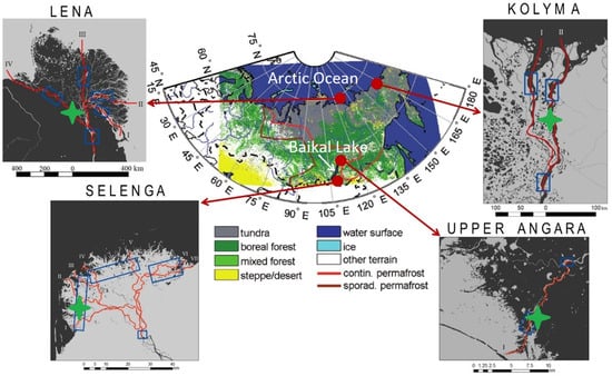 Due to mentioned limitation in knowledge, there is an open question “Will deltas be sustainable in the near future?” []. Applications of remote sensing data are the only plausible and efficient tool for identifying long-term sediment concentration patterns over extended river reaches [,]. Few studies [,] successfully demonstrated the capability of various satellite images to capture the spatial and temporal variability of suspended sediments over large rivers as well as smaller streams and plumes over river–ocean interface [,]. The present study is based on the application of Landsat images to study spatio-temporal variation of suspended sediment transport over large deltas located in the South (steppe and forest-steppe zone and discontinuous/sporadic permafrost—52.0–52.4 N for the Selenga delta and 55.6–56.0 N for the Upper Angara delta) and North (tundra, continuous permafrost area, 190 km from north to south—72.0–73.8 N for the Lena delta and 68.5–69.4 N for Kolyma). These deltas are considered as typical for the particular natural zones and thus represent possible North to South variations in sedimentation processes. Based on Landsat images collected, obtained, and processed for the last 30 years, we aimed at (1) identifying typical suspended sediment variations along studied deltas; (2) identifying environmental drivers of sediment transport changes within particular deltas and possible changes of the existing patterns; and (3) providing a comparative study of suspended sediment patterns between Northern and Southern Siberian deltas. The standardized methodology and abundant ground-truth observations both with applied remote sensing model verification enable to provide a novel comparative study.