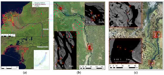 The recent detailed studies on suspended sediment budget over some large deltas such as Volga [], Terek [], Atabaska [], and Niger [] revealed uncertainties in understanding patterns of sediment concentrations along deltas. Deltas with complex channel networks can efficiently distribute and store sediment loads along the channels and within floodplain water bodies [,,]. Here, submerging of the banks and wetlands during floods was considered at the main driver of sediment retention. At the same time, increase of sediment transport has been reported based on grab sampling campaigns. For example, for the Lena delta, both increase [] and decrease [] of sediment load have been reported. Different environments might represent contrasting patterns of suspended sediment concentration (SSC) due to the contradictive nature of flow–channel interactions and channel–floodplain exchange.