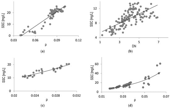 The obtained models (Table 2) were compared to each other and to the ones reported for other river systems of the large rivers of the World [,,,,]. Different relationships between SSC and ρ are explained by differences in sediment properties, mainly grain size. All models were obtained for average discharge conditions of the studied rivers, thus the effects of discharge cycle on regression models were negligible.