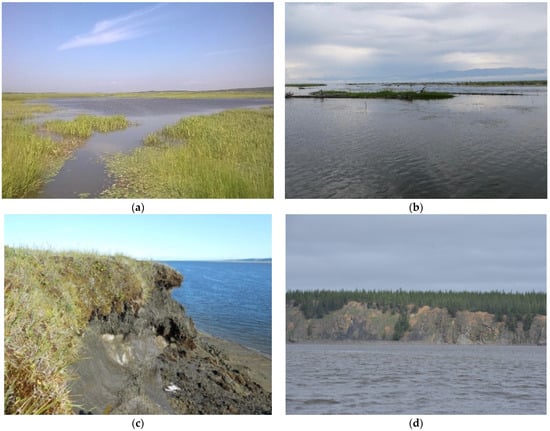 Typical sections of delta distributaries riverbanks: Selenga (a), Upper Angara (b), Lena (c), and Kolyma (d); (photos by S. Chalov (a,b), S. Pravkin (c), and V. Efimov (d)).