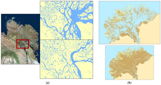 An example of the deltas’ responses to high water flows. Recorded change in surface height relative to the sea level: a fragment (a) of the Lena delta (high flow—11 June 2015 and low flow—19 September 2020) and (b) of the Selenga delta (high flow—1 September 1990, and low flow—31 August 2015). The images are based on Landsat 8 composite images.