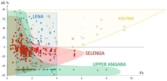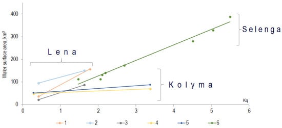 Water surface area; relative discharges Kq; and associated changes in the main distributes of the Lena delta (1—Bykovskaya, 2—Trofimovskaya, 3—Tumatskaya channels), Kolyma (4—Pokhodskaya, 5—Kamennaya channels), and Selenga (6—all of channel). Calculated on the basis of various situations in the Landsat images and Formula (3).