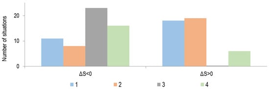 Sediment retention rates ΔS (%) at main distributaries of the Lena delta: 1—Bykovskaya, 2—Trofimovskaya, 3—Tumatskaya, 4—Olenekskaya. ΔS < 0 and ΔS > 0 relates to deposition and erosion patterns, respectively.