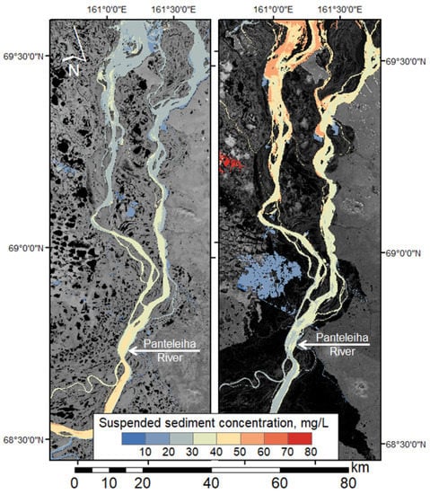 SSC distribution along the Kolyma River delta. Left picture shows sediment deposition under low discharges and possible backwater effects (19 August 2019, Q = 6300 m3 s−1); and the right picture shows erosion under high water discharges (13 June 2018, Q = 31 390 m3 s−1).