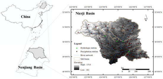 The Nierji Basin (Figure 1), located in northeast China, is defined as the area controlled by the Nierji Reservoir, located at the last gorge where the Nenjiang River enters the Songnen Plain from the mountain and hilly regions [51]. The Nierji Basin covers the source region of the Nenjiang River, where the precipitation is higher than its downstream. Therefore, the Nierji Reservoir is of great importance in flood control and water resources management, and hydrological forecasting is necessary. However, since the lush forest of the Greater Khingan Range is in the Nierji Basin, it is difficult to install and maintain precipitation stations. As a result, precipitation stations are sparse in most areas of the Nierji Basin and occasionally malfunction, so there is an urgent need for SPPs.