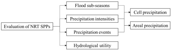The NRT SPPs were evaluated and analyzed in four aspects in this study: different flood sub-seasons, precipitation intensities, precipitation event total accumulation, and hydrological utility, as shown in Figure 2.
