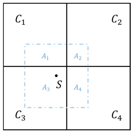 The areal weighting method to obtain the precipitation in the grid cell at the station location, where S indicates the station, indicate the four adjacent SPPs cells to S, and indicate the areas of intersection between and the window cell (within the blue dotted dashed line).