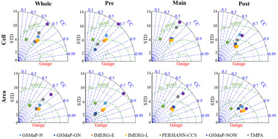 Figure 4 shows the Taylor diagrams (CC and RMSE) of the seven NRT SPPs at the cell scale and areal scale over the Nierji Basin for different flood sub-seasons, from 2008 to 2019. In the Taylor diagram, the points closer to the “Gauge” point on the X-axis show better accuracy. According to Figure 4, the distribution of points in the Taylor diagrams has three characteristics. Firstly, the point distribution of the main flood season is similar to that of the whole flood season, which is reasonable considering that 55% of wet-season precipitation occurs during the main flood season. The points in the Taylor diagrams of the pre- and post-flood seasons are more scattered and more centralized, respectively, than the points of the main flood season, meaning that the differences among SPPs are more significant in pre-flood seasons but slighter in post-flood seasons, whether at the cell scale or the areal scale. Secondly, regardless of flood sub-season, points at the areal scale have a similar distribution with those at the area scale and are closer to the “Gauge” than those at the cell scale. The potential reason for this is that the precipitation spatial biases are partly neutralized after the areal averaging. Thirdly, the points are mainly distributed along the radius of the Taylor diagram, except for PERSIANN-CCS with a minor CC, meaning that SPPs are similar in CC and the main difference in SPPs is the RMSE.