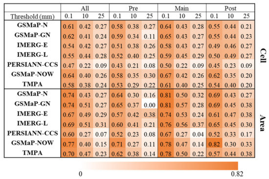 Comparison and analysis were carried out among different sub-seasons, scales, thresholds, and products according to Figure 5. Figure 5 shows CSI at the cell scale and areal scale for different flood sub-seasons and thresholds using a heat map, where a darker color means the better value. Firstly, the CSI at the areal scale is larger than that at the cell scale. When the threshold is equal to 0.1, the CSI at areal and cell scales varies from 0.52 to 0.82 and from 0.43 to 0.67, respectively, which means SPPs at the areal scale are better at detecting precipitation occurrence than that at cell scales. Secondly, the lower the detection threshold, the stronger the detection ability of SPPs. The detection ability with a threshold of 0.1 is the best in this study, and the detection ability of each SPP in the main flood season is the best of the different flood sub-seasons. Thirdly, the heat distribution of the flood sub-season blocks is similar at the cell scale. Under any detection threshold, the difference between the maximum and minimum CSI of flood sub-seasons is no greater than 0.1, indicating that the influence of flood sub-seasons on the detection ability of SPPs is slight. Fourthly, the detection ability of PERSIANN-CCS is the worst, and the GSMaP-GN’s ability to detect heavy rainfall in pre-flood seasons is unsatisfactory with the CSI of 0.11 and 0 at the cell scale and the areal scale, respectively. The main reason for this is that GSMaP-GN significantly underestimates heavy rainfall in pre-flood seasons, so there is little rainfall monitored by NRT SPPs exceeding the threshold of 25 mm/day. The detection ability of GSMaP-N and GSMaP-GN is the best in the main flood seasons at the areal scale. GSMaP-NOW performs well in terms of detection ability, with a threshold of 0.1, especially in the post-flood season when the CSI is equal to 0.82.