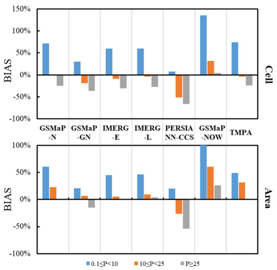 Figure 6 shows the BIAS of SPPs with different precipitation intensities. The positive and negative BIAS indicates the overestimation and underestimation of the evaluated SPP, respectively. It is worth noting that when the BIAS is close to 0, it cannot fully conclude that the SPP is accurate, but only indicates that the precipitation estimates are not obviously heavier or lighter. According to Figure 6, SPPs tend to overestimate light precipitation. The product that overestimates light precipitation most significantly is GSMaP-NOW, with a BIAS of 135.7% and 100.67% at the cell scale and areal scale, respectively, followed by GSMaP-N, TMPA, IMERG-E, and IMERG-L, with a BIAS of 60–75% at the cell scale and 45–60% at the areal scale. GSMaP-GN and PERSIANN-CCS overestimate light precipitation the least. For heavy precipitation, apart from GSMaP-NOW, SPPs underestimate heavy precipitation at the cell scale. The underestimate of PERSIANN-CCS is the most significant, with a BIAS of −66%, while the BIAS of the rest of the SPPs varies from −24% to −37%. At the areal scale, the SPP estimates of heavy precipitation are not significantly heavier or lighter than gauge-based observations, with a BIAS of less than ±15%, except for the underestimates of PERSIANN-CSS and the overestimates of GSMaP-NOW. Overall, SPPs deviate more at the cell scale than at the areal scale.