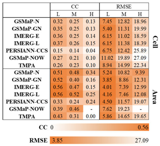 Heat map of CC and RMSE at the cell scale and the areal scale for different precipitation intensities, where L, M, and H indicate light precipitation, moderate precipitation, and heavy precipitation, respectively.