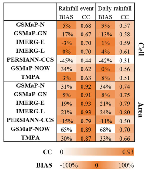 Figure 8 shows CC and BIAS at the cell scale and areal scale for precipitation events and daily rainfall when rainfall exceeds 0.1 mm/day; the exclusion of RMSE is due to the significant difference between the accumulation of rainfall events and daily rainfall. Overall, accumulation estimations of rainfall events perform better than those of daily rainfall, and SPPs tend to overestimate the precipitation volume either at the cell scale or areal scale and either at the event scale or the daily scale, except for PERSIANN-CCS and GSMaP-GN. Additionally, the CC at the event scale is high with a maximum of 0.93 (IMERG-E and IMERG-L) and a minimum of 0.79 (PERSIANN-CCS, although whose daily CC is 0.50 and 0.31 at the areal scale and cell scale, respectively). IMERG-L performs best at the event-cell scale with CC of 0.7 and BIAS of 0%, while GSMaP-GN performs best at the event-areal scale with CC of 0.91 and BIAS of 5%. It is worth noting that GSMaP-NOW significantly overestimates areal precipitation with BIAS of 65% and 68% for area-event scale and area-daily scale, respectively, but can reflect the precipitation variation, as indicated by the relatively high CC (0.89 and 0.7 for area-event scale and area-daily scale, respectively). Therefore, the system error of areal precipitation overestimation should be corrected before GSMaP-NOW is employed at area scale.