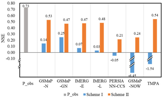 NSE of simulated daily discharge at Kehou station during wet seasons from 2008 to 2019 for Scheme Ⅰ, Scheme Ⅱ, and using gauge-based precipitation.