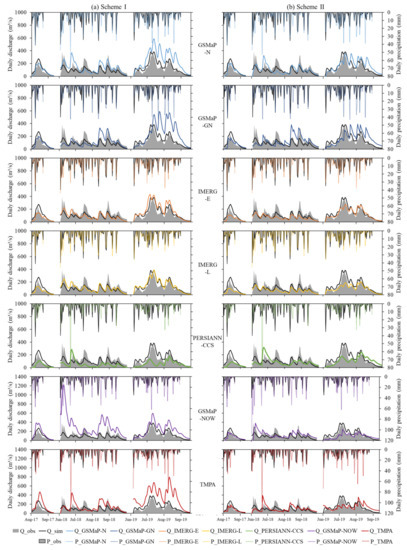 An NSE of simulated discharge against the observed discharge at Kehou station during the wet seasons from 2008 to 2019 is shown in Figure 9. The observed and simulated daily discharge at Kehou station during wet seasons from 2017 to 2019 is shown in Figure 10. As shown in Figure 9, simulated discharge by inputting gauge-based precipitation with an NSE of 0.73 performed better than that simulated by inputting SPPs for both Scheme Ⅰ and Scheme Ⅱ. In Scheme Ⅰ, the GSMaP-GN-based NSE was the best but was only 0.25. Furthermore, the NSE based on PERSIANN-CCS, GSMaP-NOW, and TMPA in Scheme Ⅰ was negative, indicating the poor performance of the simulated discharge. The NSE based on GSMaP-NOW reached −6.45; this NSE was caused by the significant overestimations of precipitation, which can be seen in Figure 10a. After recalibrating the hydrologic model with SPPs, as in Scheme Ⅱ, NSE significantly improved. Among the SPPs, TMPA showed the most significant improvement after recalibration, with an NSE ranging from −1.54 to 0.54, and became the best in Scheme Ⅱ. Additionally, GSMaP-N, GSMaP-GN, IMERG-E, and IMERG-L also performed well in Scheme Ⅱ. Although the five SPPs with better hydrological utility had similar NSEs, ranging from 0.47 to 0.54, the simulated discharge based on the above products was different, as shown in Figure 10b. Taking GSMaP-GN and IMERG-L in 2019 as an example, GSMaP-GN-based discharge fit the observed discharge well in June and July but poorly in August and September, while IMERG-L-based discharge showed the opposite effect.