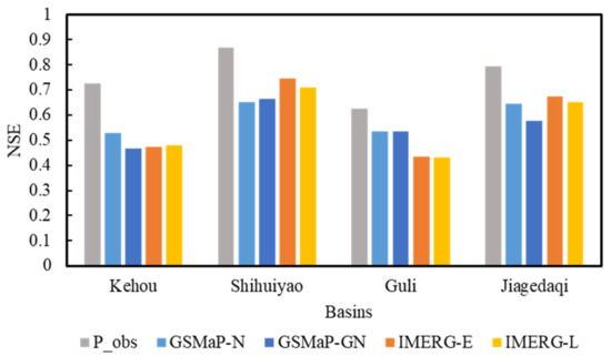 Based on the above evaluation and comparison, GSMaP-N, GSMaP-GN, IMERG-E, and IMERG-L were selected to recalibrate the hydrologic model for the basins controlled by Shihuiyao, Guli, and Jiagedaqi stations. TMPA was excluded due to its limited coverage of 50°S–50°N, which cannot cover the other three basins. Figure 11 shows the NSE of simulated discharge compared to the observed discharge at Kehou, Shihuiyao, Guli, and Jiagedaqi stations during the wet seasons from 2008 to 2019. It can be seen from Figure 11 that the four products performed similarly in the same basin with an NSE of no more than 0.1. The difference in the NSE based on P_obs among various basins was similar to that based on the SPPs, so the difference was mainly caused by the different abilities of the hydrological model to describe hydrologic responses in different basins.