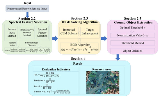 In view of the complex and diverse spectra of remote sensing images of objects on the ground in the research area, the method proposed in this paper is mainly divided into three stages—namely, spectral feature selection, an IEGD solving algorithm, and ground object extraction. First of all, this paper uses the feature index method and the Bhattacharyya Distance (BD) method to screen the sensitive wavebands to form the spectral feature set. Secondly, the CEM scheme aided by the proposed IEGD algorithm is used to enhance the target ground object and weaken the background spectral information. Finally, Otsu’s method is used to calculate the division threshold to achieve ground object extraction. Figure 1 shows the technical route map.