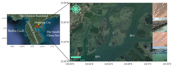 The research area in true color with image examples are raft and cage aquaculture areas on the satellite (a1 and b1, respectively) and ground (a2 and b2, respectively).