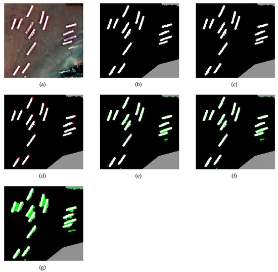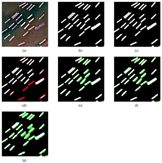 Figure 7. The details of the results of aquatic product extraction by different methods in Region c, with a black color denoting the background, white color denoting the aquaculture raft, red color denoting the missing extraction, and green color denoting more extraction. (a) Original image. (b) Ground truth image. (c) IEGD. (d) CEM. (e) NN. (f) SVM. (g) MLE.
