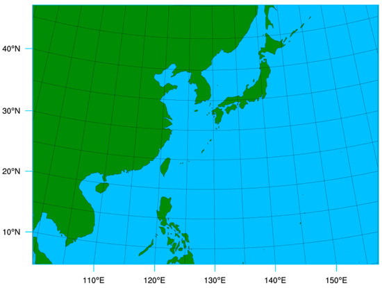 This study adopted the WRF model version 4.0. Reanalysis data provided by the National Centers for Environmental Prediction (NCEP) with a resolution of 0.25° × 0.25° were used as initial boundary conditions. The model domain (Figure 2) was from the western Pacific Ocean to the southeast coast of China, with its center at (128.4°E, 29.3°N) and the number of horizontal grids was 721 × 541 for a single domain. The horizontal grid distance of the WRF model was 9 km with 57 vertical levels, with the model’s top pressure at 50 hPa.