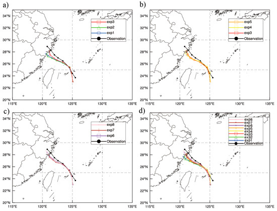 The track for: (a) exp1, exp2, and exp3, (b) exp3, exp4, and exp5, (c) exp6, exp7, and exp8, (d) all the experiments for the 42 h forecasts from 0600 UTC 8 August to 0000 UTC 10 August 2019.