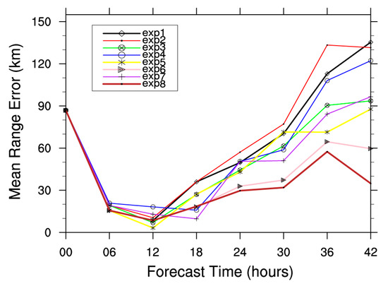From Figure 4, the mean track error from exp2 is the highest. The experiment exp8 yields the smallest track error consistently. It proves that the selection of the microphysical process scheme has the greatest influence on the simulation of the typhoon’s track. It seems the WSM6 scheme is the main factor leading to a positive forecasting effect of the typhoon’s track. The combination of the WSM6 mp_physics, RMM5 sf_sfclay_physics, and the YSU bl_pbl_physics is the best.