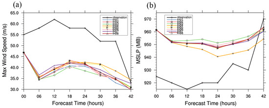 Figure 5 shows the results of the typhoon intensity from the eight experiments along with the observed track. Overall, the intensity from the simulated typhoon is weaker than the observed track in terms of both MSLP and MWS. In Figure 5a, except for exp4, the results of other experiments are basically similar for the whole period. The largest average error is from exp3, due to the weakest predicted typhoon intensity. It seems that the selection of microphysical schemes has a slight effect on the simulation of the typhoon’s intensity. In general, the intensity of exp4 matches best with the observed track for both MSLP and MWS. The results show that the intensity of the simulated typhoon is more sensitive to surface physics schemes.