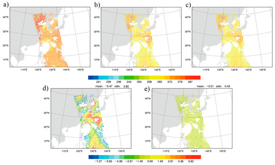 The simulated Tb from the background and the analysis were compared with the observations along with the distribution of the observations minus background (OMB) and the observations minus analysis (OMA). From Figure 6a–c, the simulated Tb values of the background are notably warmer than the observed Tb values. After assimilating the MWHS radiance data, the simulated Tb is rather consistent with the observation. By comparing Figure 6d,e, it is shown that the magnitude of OMA is obviously smaller than that of OMB with the bias correction. In addition, the mean and standard deviation (stdv) of OMA are significantly less than those of OMB.