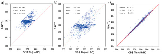 From the scatter plots of Figure 7a, almost all the scattered points lie above the contour line, indicating that the background simulated Tb values are higher than the observed Tb values. From Figure 7b, it is noted that the bias is largely corrected by comparing the observed Tb and the background Tb after the bias correction. Meanwhile, the root mean square (rms) error values of OMB are sharply decreased. Figure 7c shows the scatters of the analysis against the observation. Compared with Figure 7b, the distribution of scatter points around the isoline is denser and more convergent. Both the stdv and the rms of OMA are decreased to 0.433 K (Figure 7c), which indicates that the analysis better fits the observation.