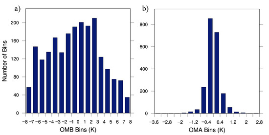 Figure 8a is the histogram of the difference between the observed Tb and the simulated Tb based on the background, while the difference between the observation and the assimilation analysis is provided in Figure 8b. It is found that the residual distribution of OMB is more discrete from −8 to 8, while the peak area of the OMA residual distribution is closer to 0 K.