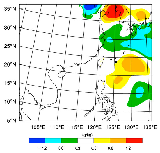 Figure 9 represents the water vapor increment (the analysis minus the background) at 850 hPa at 0600 UTC 8 August. The black dot in this figure depicts the location of the typhoon center (23.7°N, 125.5°E). The positive water vapor increment is distributed near the east and the south of the typhoon center (the black dot in Figure 9). Moreover, a high water vapor increment is also observed near the Korean peninsula. It illustrates that the assimilation of the FY-3D MWHS-2 satellite data increases the humidity around Lekima and may be conducive to the analysis conditions of the water vapor.