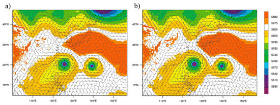 Finally, the circulation structures related to the typhoon evolution is analyzed to further explore the improvements of forecast accuracy, valid at 0600 UTC 8 August 2019. In Figure 11a,b, the geopotential height at 500 hPa is shown for the background and the analysis. The subtropical high in the analysis is further east than that in the background. The southeast airflow on the southwest side of the subtropical high contributes to the northwest movement of Lekima, which is consistent with that in Figure 12d of the simulated track.
