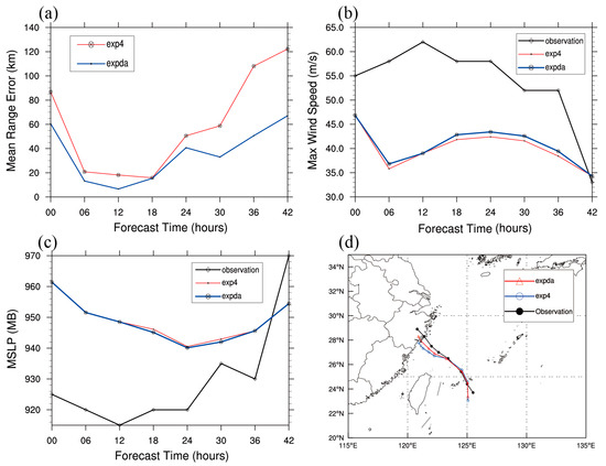 (a) mean range error (units: km), (b) max wind speed (units: m/s), (c) minimum sea level pressure (units: MB), and (d) the typhoon’s tracks for numerical experiments and observed track from 0600 UTC 8 August to 0000 UTC 10 August 2019.